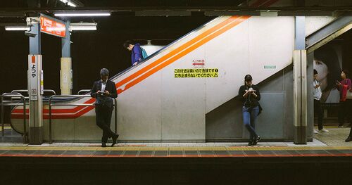 通勤時もカメラを携行していることもあるけど、そもそも好きなテーマなので、駅や電車内での写真が増えていく。 おじさんとお姉さんとが同じ電車待ちポーズだったので、線対称にして撮る。